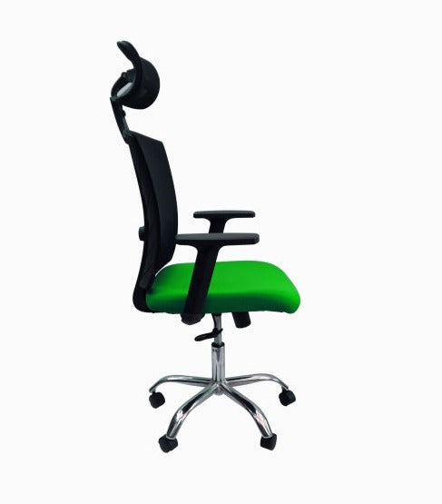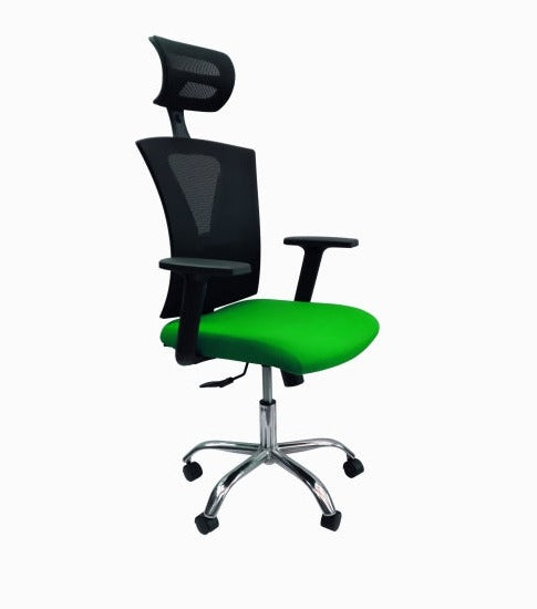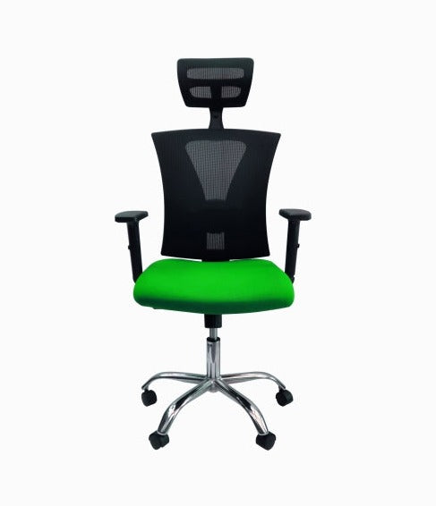 Asiento interno en polipropileno abullonado con espuma inyectada de alta densidad tapizado en malla color VERDE antitranspirante de excelente calidad. Graduación de altura mediante palanca que activa cilindro neumático en cromo.