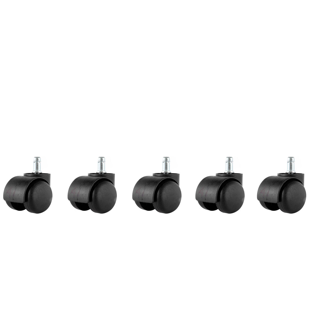 Kit Original de Rodachinas de doble Rueda de la mas alta calidad , perfectas para sillas de Alto movimiento y uso. El kit se compone de 5 Unidades de rodachinas de 50mm de diámetro en sus ruedas para instalarlas en la base araña de cualquier silla.