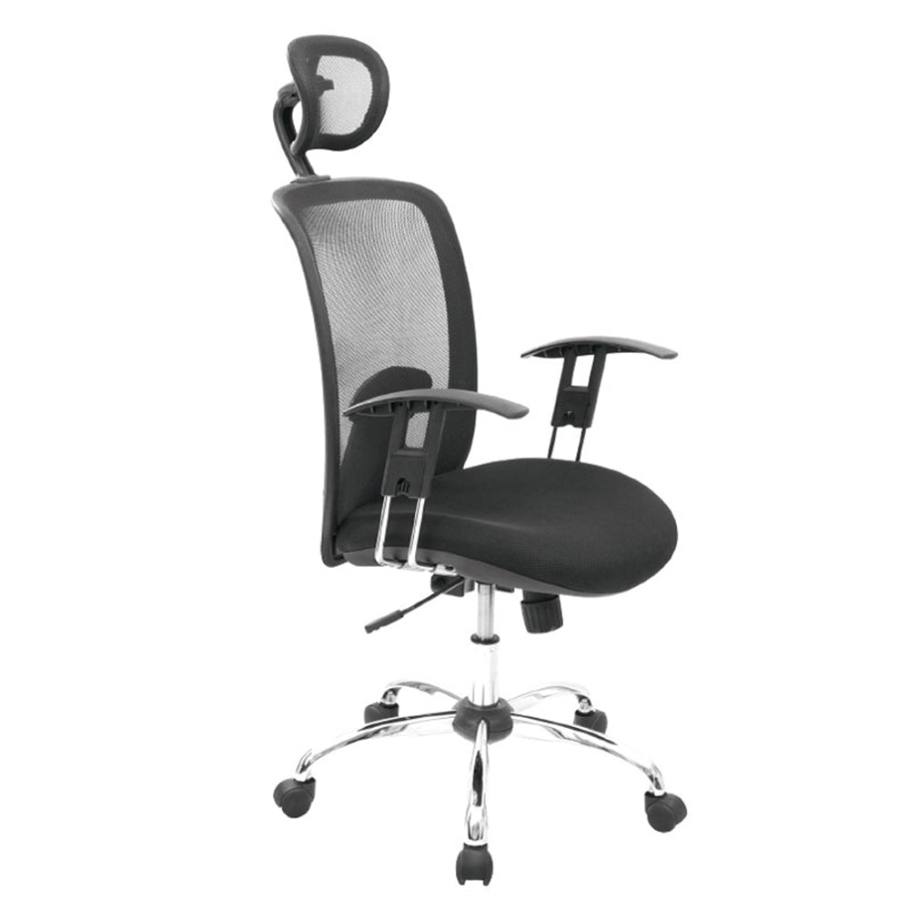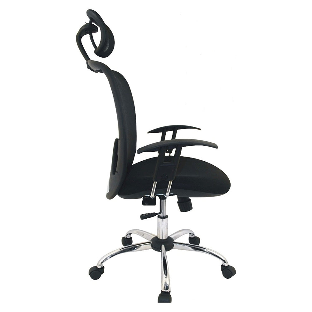 Esta silla cuenta con: -Asiento Graduable en altura de alta calidad con mecanismo 5 bloqueos -Brazo graduable en altura -Cabecero graduable en altura y basculamte -Marco negro -Asiento Paño -Espalda Malla -Base Cromo