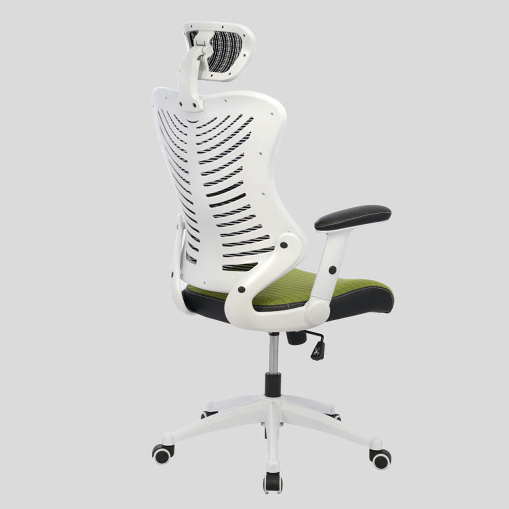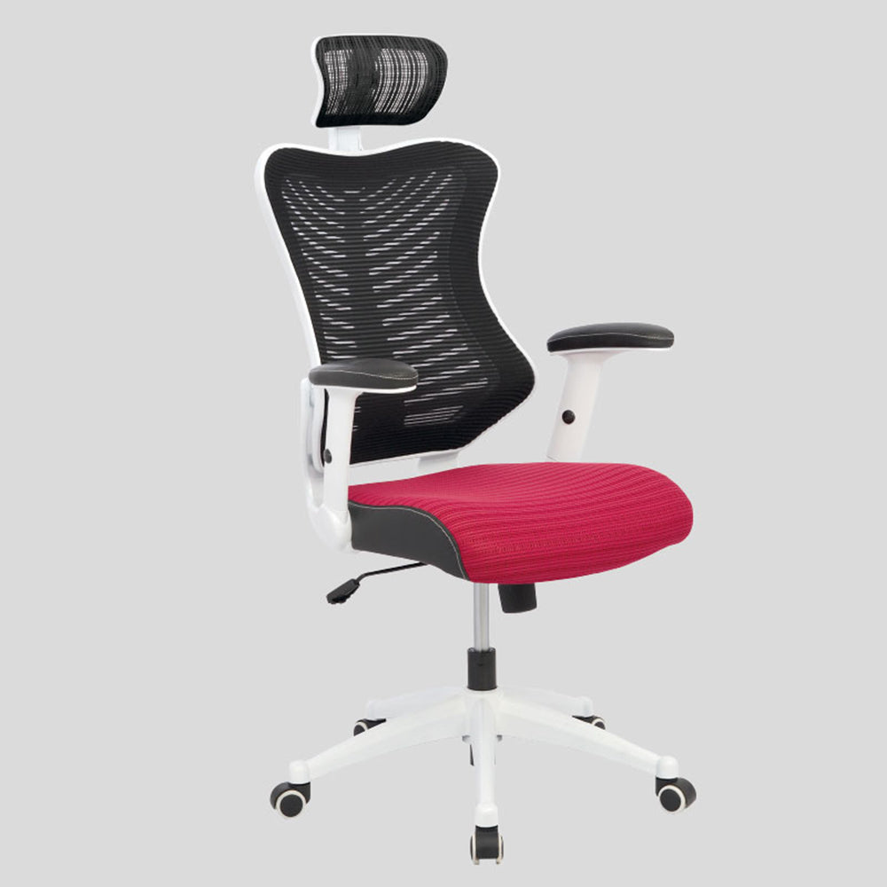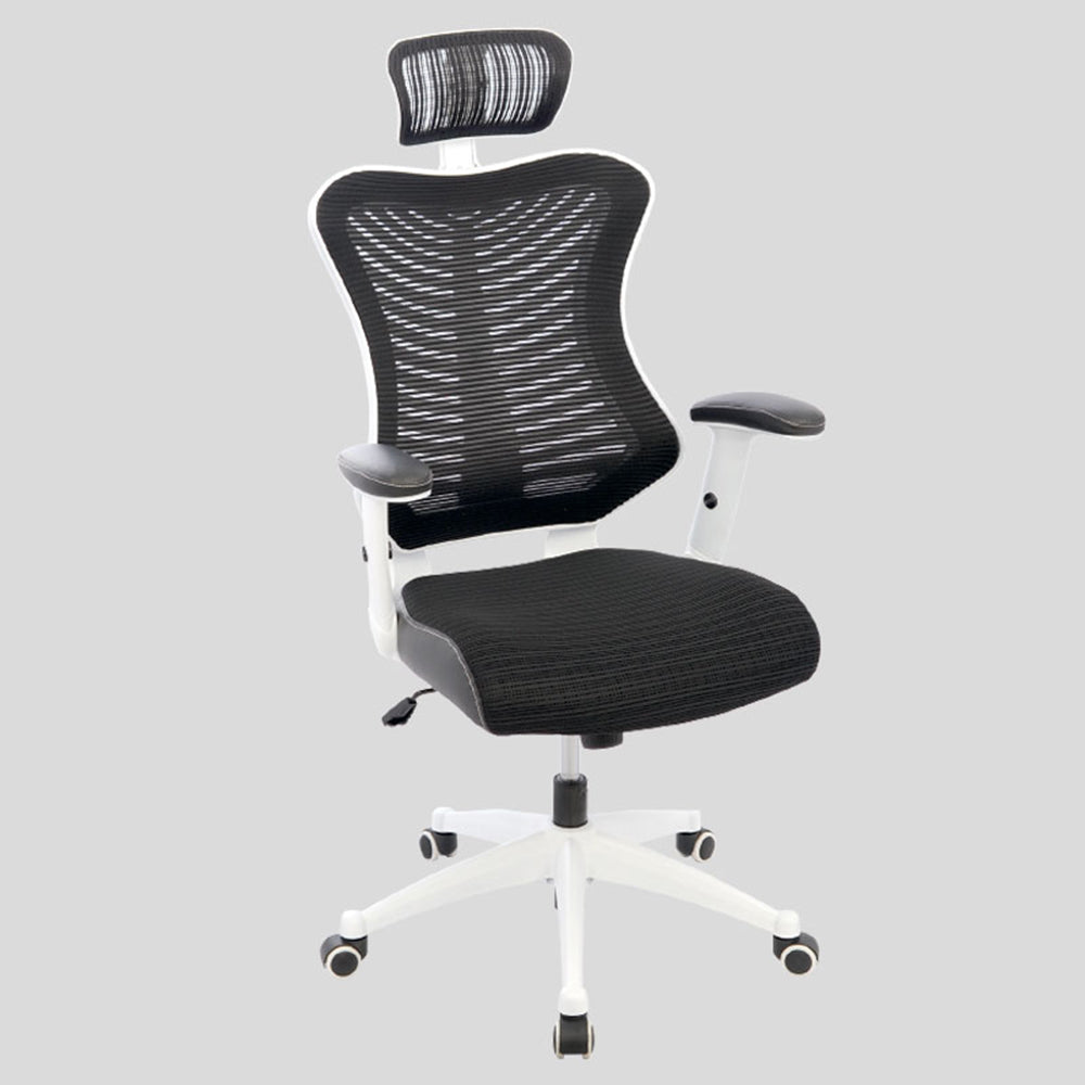 Esta silla cuenta con: -Un asiento graduable en altura - Un Par de brazos graduables en altura - Base Nylon -Marco Blanco -Espaldar en Malla -Asiento en Paño -Con Cabecero