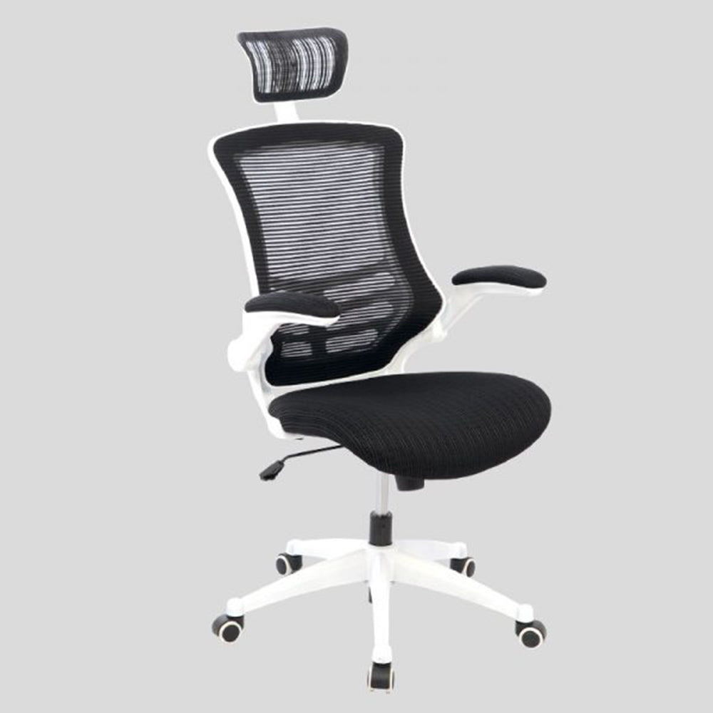Esta silla cuenta con: -Un asiento graduable en altura - Un Par de brazos Abatibles (se levantan 90°) - Base Nylon -Marco Blanco -Espaldar en Malla -Asiento en Paño -Cabecero graduable y Basculante 2D