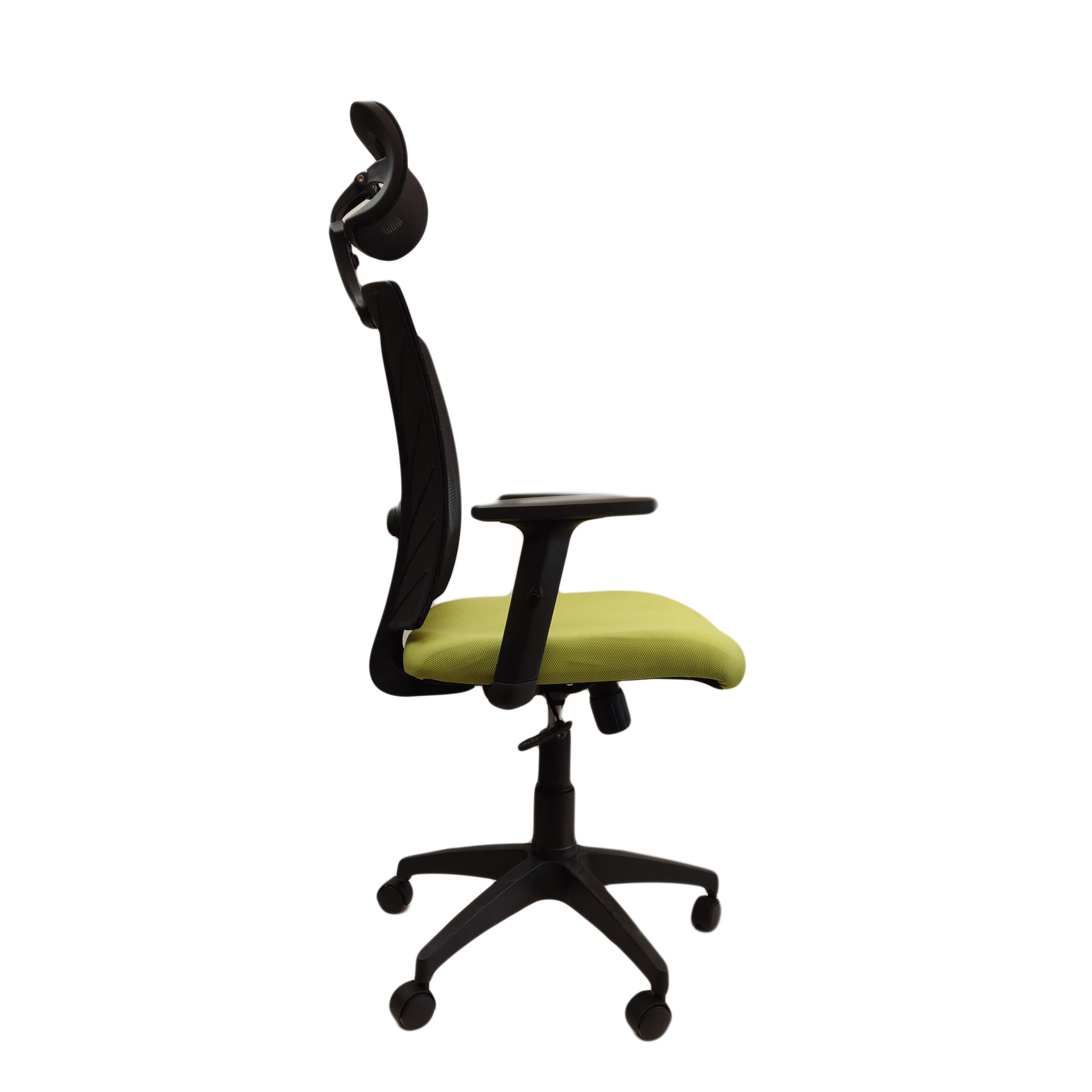 Silla ejecutiva ergonómica con espalda en marco polipropileno de alto impacto con malla traslucida. Apoyo lumbar graduable en altura y profundidad tapizado color VERDE. Cabecero graduable en altura e inclinación tapizado en malla.