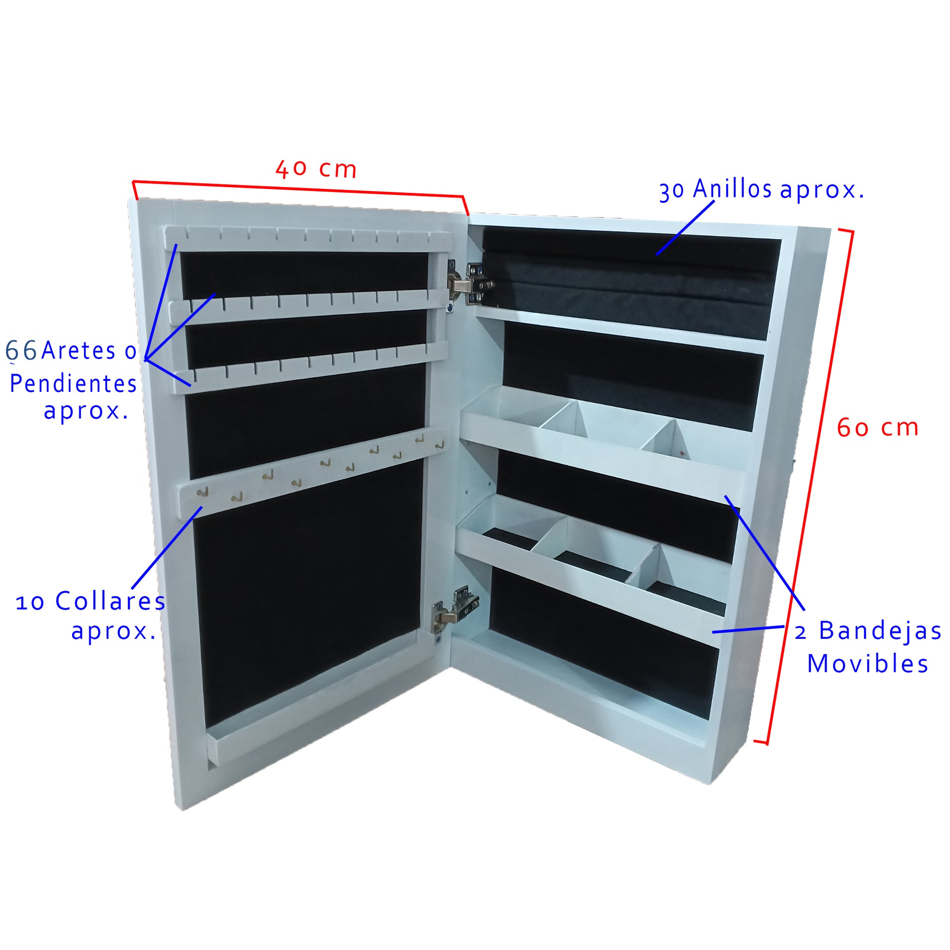 Podrá guardar y clasificar sus accesorios de forma organizada gracias a su disposición y espacio de almacenamiento sobredimensionado. El interior tiene 54 ranuras para Aretes y pendientes, 10 ganchos para collares y pulseras, y el lado derecho tiene 2 ranuras para anillos, 2 bandejas movibles de almacenamiento y 1 bandeja fija inferior; Diseño de espejo de Medio cuerpo. También es una decoración perfecta para su dormitorio o sala de estar; Este Organizador con espejo está hecho de MDF resistente y duradero. Además, está forrado con terciopelo negro para proteger sus joyas de arañazos. Se adapta perfectamente a cualquier tipo de decoración;